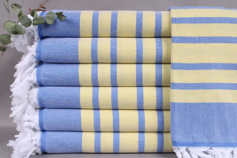 The product line comprises towels, blankets, and throws woven from organic Turkish cotton, ensuring high absorbency and durability. Each item measures 36x67 inches or 90x170 centimeters, weighing approximately 380 grams. The hand-weaving process results in a tolerance of ± 2 inches or 5 centimeters.
