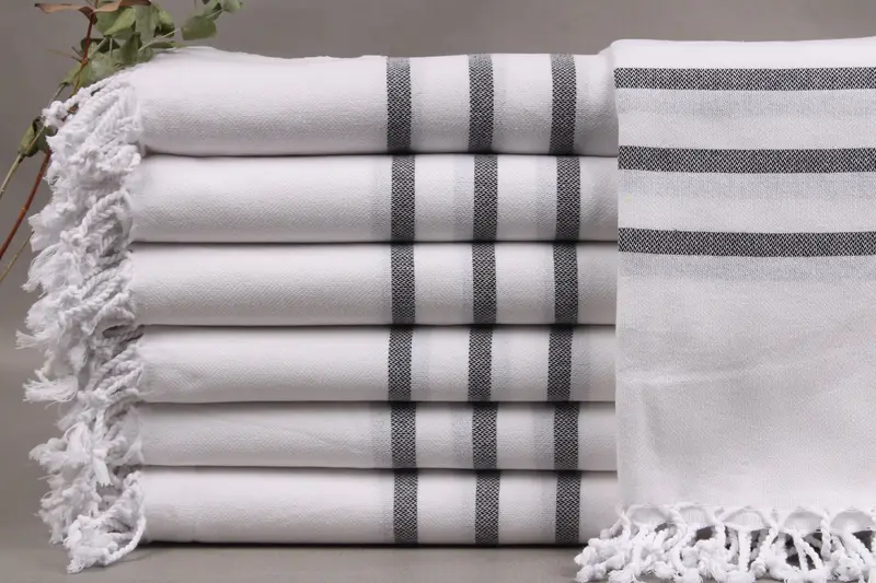 Turkish Beach Towels, Hand Towels, and Blankets are woven from organic Turkish cotton, ensuring durability and exceptional absorbency. Resulting in products characterized by soft texture, these items measure 40x71 inches or 100x180 centimeters, weighing approximately 420 grams. The hand-weaving process allows for a tolerance of ±2 inches or 5 centimeters.