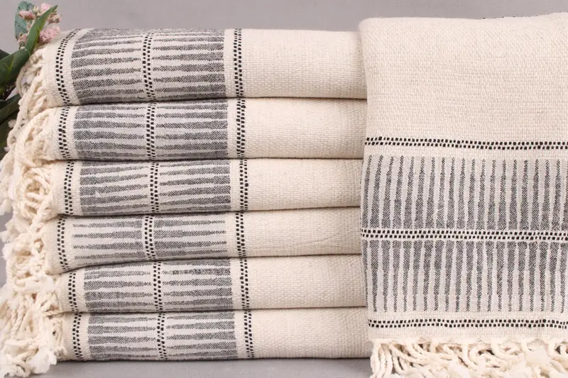 Woven from organic Turkish cotton, these beach towels are characterized by their soft texture and high absorbency, ensuring comfort and durability. Each towel measures 40x71 inches (100x180 cm) with a tolerance of ±2 inches (5 cm) due to hand-weaving, and weighs 340 grams. Pre-shrunk and ready for first use, they offer customization options through embroidery or personalized names.
