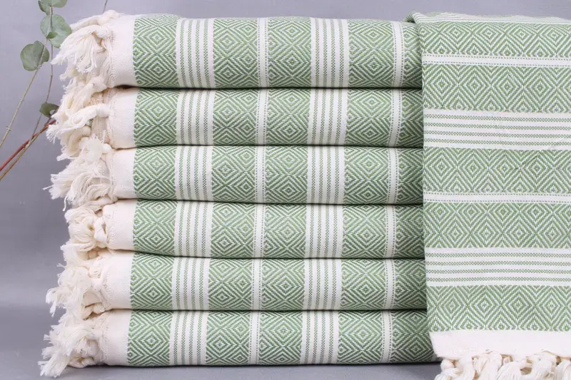 The Turkish beach towel is woven from organic Turkish cotton, ensuring durability and high absorbency. Resulting in a product that is both lightweight, weighing 440 grams, and robust. The towel's dimensions are 38x69 inches or 95x175 centimeters, with a tolerance of ± 2 inches or 5 centimeters due to hand-weaving.