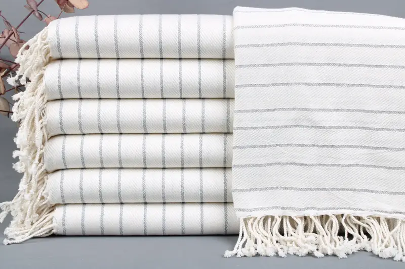 Constructed from organic Turkish cotton, the beach towels, blankets, and throws ensure superior absorbency and softness. Characterized by a dimension of 40x70 inches or 100x180 centimeters, these items weigh between 425-475 grams. Weaving tolerances may result in a variation of ±2 inches or 5 cm.