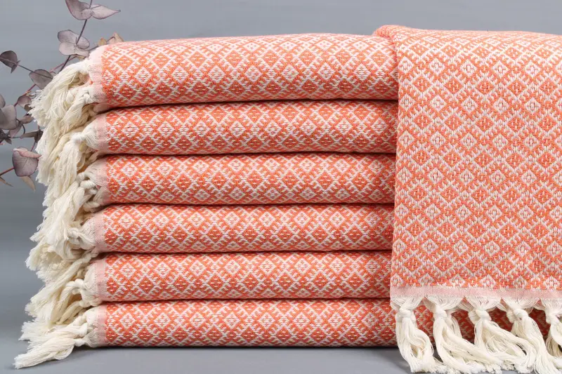 Turkish towels are woven from organic Turkish cotton on looms, characterized by their hand-weaving process resulting in subtle dimensional variations of ±2 inches or 5cm. The towels measure 20x38 inches or 50x95 centimeters, with a weight of 100 grams, ensuring a balanced combination of absorbency and lightweight usability. Each towel, blanket, or hand towel may be personalized with embroidered letters, names, or logos, enhancing customization options, and are shipped with pre-shrunk status for immediate use.