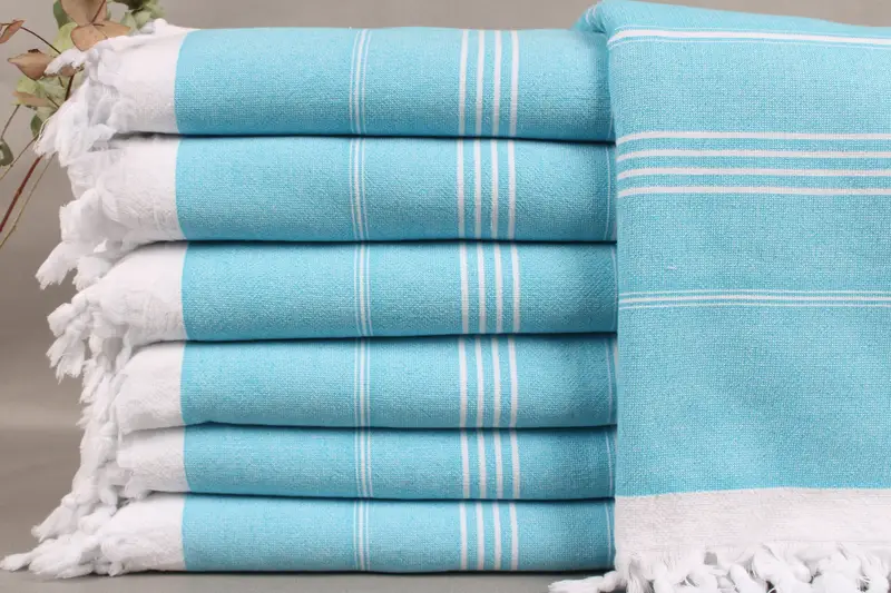 Turkish towels are characterized by their construction from Organic Turkish cotton, ensuring a high level of absorbency and durability. The towels measure 36x67 inches or 90x170 centimeters, weighing 400 grams. These towels are handmade on looms, with a weaving tolerance of ± 2 inches or 5 centimeters.