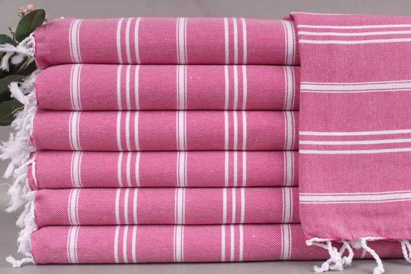 The handwoven dish towel, face towel, fuchsia towel, striped towel, and 24x40-inch Turkish towel are characterized by their fiber composition of organic Turkish cotton, ensuring superior absorbency and durability. These towels measure precisely 24x40 inches or 60x100 centimeters, with a weight of 100 grams. There may be slight variations in size, up to ± 2 inches or 5 centimeters, due to the hand-weaving process.