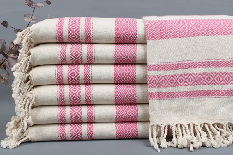Organic Turkish cotton characterizes each product, ensuring high absorbency. Dimensions for the towels are 40x70 inches or 100x180 centimeters, with a tolerance of ± 2 inches or 5 centimeters due to weaving. Each product weighs between 425 to 475 grams.