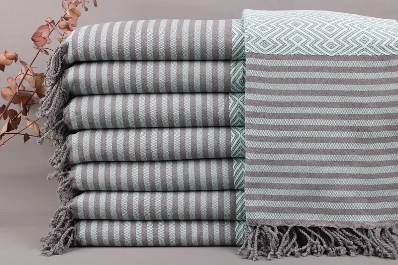 Organic Turkish cotton characterizes the fiber composition of all Turkish towels, beach towels, and blankets, ensuring high absorbency and soft texture. Resulting in dimensions of 40x70 inches or 100x180 centimeters, each item can weigh between 425-475 grams, with a hand-weaving tolerance of ±2 inches or 5 centimeters. Customization options include embroidery, name inscriptions, and logo placements on selected items, with recommended font choices and placement at the middle of the bottom.
