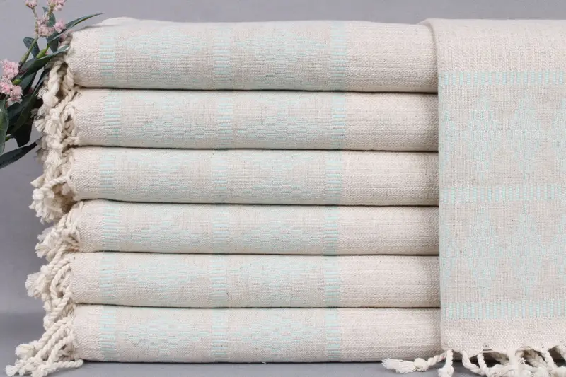 Organic Turkish cotton ensures the towels' high absorbency and durability, resulting in a soft texture that becomes progressively more comfortable with each wash. Characterized by dimensions of 20x40 inches (50x100 centimeters) and a weight of 120 grams, these towels feature a hand-weaving tolerance of ±2 inches or 5 centimeters. The products allow for embroidery customization with letters, names, or logos, and pre-shrunk towels ensure consistent sizing across washes.