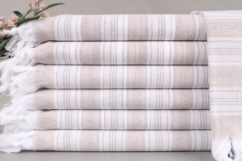 Woven from Organic Turkish Cotton, the towels ensure high durability and exceptional absorbency. Resulting in soft and plush texture post-washing, these towels are hand-woven on looms, each item measuring 40x71 inches or 100x180 centimeters with a tolerance of ± 2 inches or 5 centimeters. Each towel weighs 124 grams and can be personalized with embroidery or printed names, available in various colors.