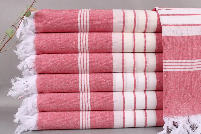 Each towel is woven from organic Turkish cotton on looms, ensuring high quality and comfort. Characterized by their soft texture and durability, these towels are pre-shrunk and recommended to be washed before first use, resulting in increased softness with each subsequent wash. Measuring 40x71 inches or 100x180 centimeters, with a weight of 216 grams, the towels exhibit a hand-weaving tolerance of ±2 inches or 5 cm.