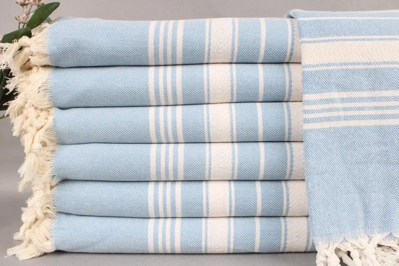 The Turkish towels are woven from organic Turkish cotton, ensuring durability and high absorbency. Each towel measures 71x40 inches or 180x100 centimeters, weighing approximately 340 grams. The weaving process results in a tolerance of ± 2 inches or 5 centimeters.