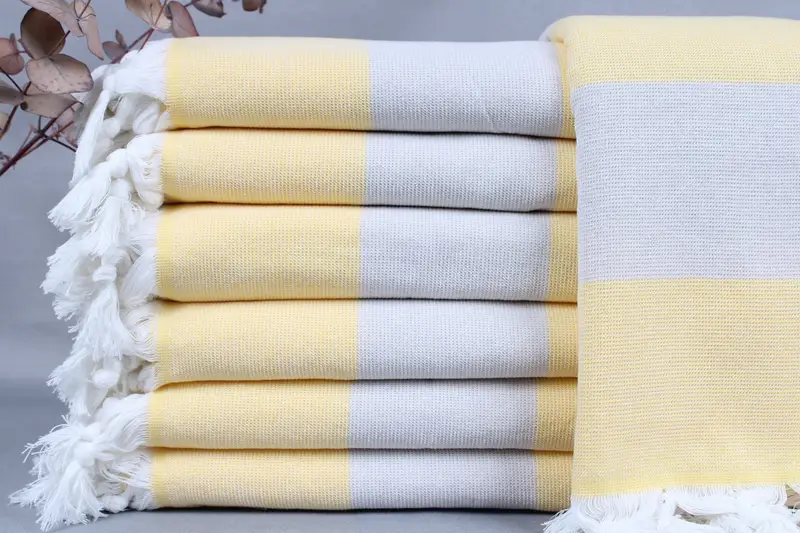 The Turkish Towels are woven from organic Turkish cotton, characterized by their high absorbency and softness. Ensuring durability and comfort, these towels are hand-woven on traditional looms and individually cut, resulting in a product that may exhibit slight variations in size. Tolerances in dimension are ± 2 inches or ± 5 cm due to the hand-weaving process.
