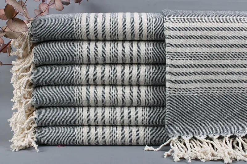 Characterized by Turkish cotton, these beach towels, blankets, and tea towels ensure superior absorbency and comfort. Dimensions are 40x70 inches or 100x180 centimeters, with a weight range of 425-475 grams. Hand-weaving tolerances permit variations of ± 2" or 5cm.