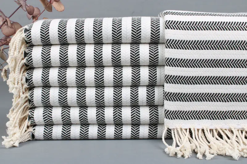 Woven from organic Turkish cotton, the towels are characterized by their high absorbency and durability. Each towel weighs between 425-475 grams, providing a soft yet robust texture. Dimensions measure 40x70 inches or 100x180 centimeters, with a tolerance of ± 2 inches or 5 centimeters due to hand-weaving.