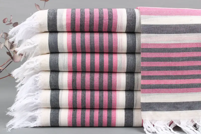 Organic Turkish cotton characterizes the material composition of these towels and blankets, ensuring high absorbency and softness after washing. Resulting in dimensions of 40x67 inches or 100x170 centimeters, each item weighs 175 grams, with a weaving tolerance of ± 2 inches or 5 centimeters.