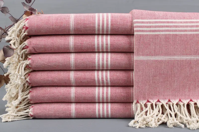 Organic Turkish cotton ensures superior absorbency and durability for the bath towels, hand towels, and blankets. Characterized by dimensions of 40x70 inches or 100x180 centimeters, these items typically weigh between 425-475 grams with a tolerance of ± 2 inches or 5 centimeters due to hand-weaving. The personalization options include embroidery or imprinting of letters, names, or logos in selected fonts and colors at specified placements on the product.