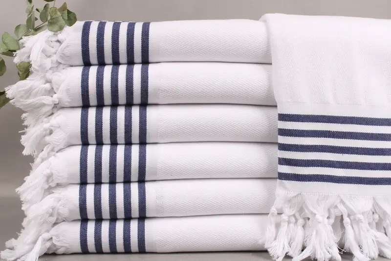 The collection comprises towels and blankets woven from organic Turkish cotton, ensuring softness and durability. Characterized by a size of 40x67 inches or 100x170 centimeters, each piece weighs approximately 360 grams and is subject to a hand-weaving tolerance of ± 2 inches or 5 centimeters. Each product can be personalized with letters, names, or logos through embroidery, with options for font selection and placement.