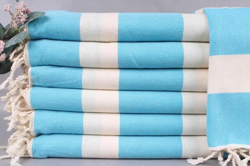 Weaving: Characterized by handmade craftsmanship, each product is crafted from organic Turkish cotton using traditional looms, ensuring durability and quality. The towels exhibit a natural absorbency, enhancing their utility across various contexts. Dimensions: Standard measurements are 40x71 inches or 100x180 centimeters, with a tolerance of ±2 inches or 5 centimeters due to the weaving process. Each piece weighs approximately 260 grams, providing a balance between lightweight portability and substantial coverage.