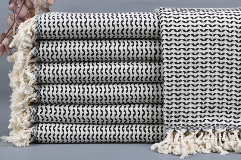 Organic Turkish cotton ensures a superior quality product characterized by high absorbency and durability. The towels measure 40x70 inches or 100x180 centimeters, weighing between 425 and 475 grams, with a hand-weaving tolerance of ± 2 inches or 5 centimeters.