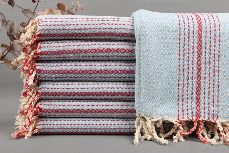 Turkish towels are woven from organic Turkish cotton, ensuring high-quality and eco-friendly fiber composition. Resulting in a weight range of 425-475 grams, these towels are characterized by a size of 40x70 inches or 100x180 centimeters, with a tolerance of ± 2 inches or 5 centimeters due to hand-weaving.