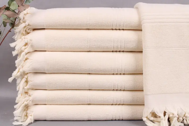 Organic Turkish cotton ensures high absorbency, resulting in effective moisture management and durability. Characterized by hand-weaving, each item measures 36x71 inches or 90x180 centimeters with a tolerance of ± 2" (5 cm). Weighing 500 grams, these towels promise precision with each handcrafted piece.