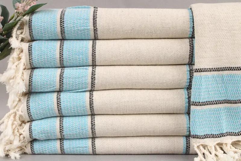 Woven from organic Turkish cotton, these beach towels ensure excellent absorbency and durability. Resulting in a soft texture that improves with each wash, each towel measures 36x71 inches (90x180 centimeters) with a tolerance of ±2 inches or 5 centimeters due to hand-weaving techniques. Characterized by a weight of 430 grams, the towels are meticulously handcrafted.