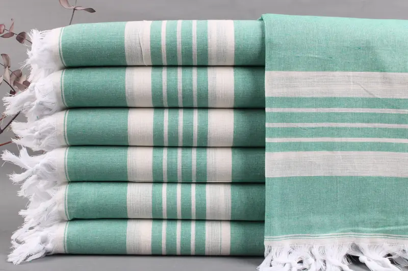 Organic Turkish cotton characterizes the towels, ensuring a soft and absorbent texture. Each product measures 40x71 inches or 100x180 centimeters, weighing approximately 270 grams. Tolerances of ± 2 inches or 5 centimeters may occur due to hand weaving.