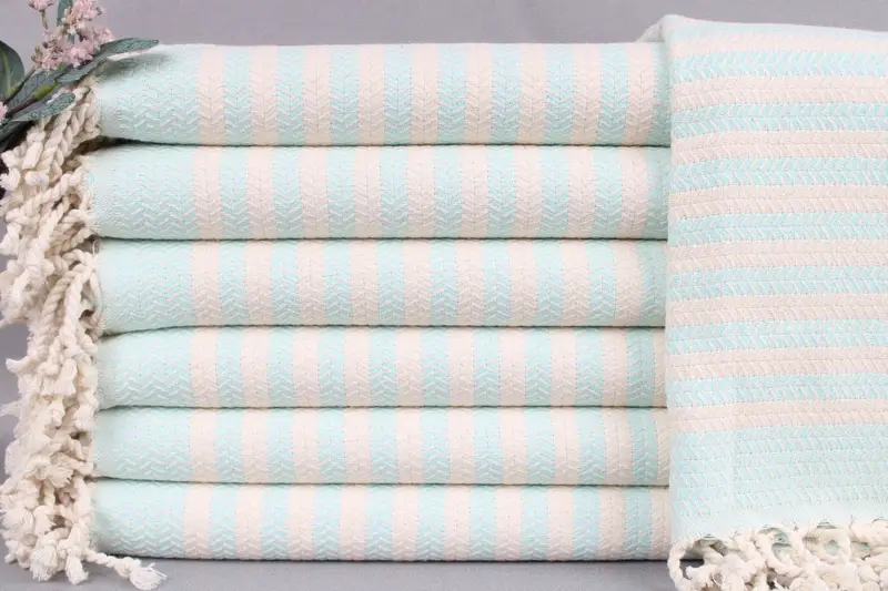 Turkish beach towels are characterized by their fiber composition, woven from organic Turkish cotton on looms. These towels are notable for their absorbency, ensuring quick drying and comfort. Each towel is handmade and measures 40x71 inches or 100x180 centimeters, weighing 440 grams with a tolerance of ± 2 inches or 5 centimeters due to weaving techniques.