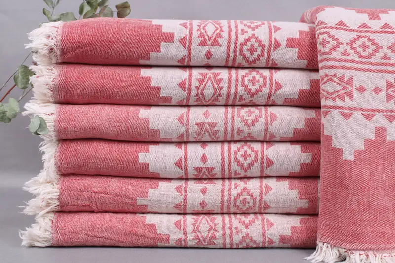 The towels, hand towels, and blankets are woven from organic Turkish cotton, ensuring durability and high absorbency. These items measure 79x91 inches or 200x230 centimeters, with a weight of 1082 grams. The hand-weaving process results in a tolerance of ± 2 inches or 5 centimeters.