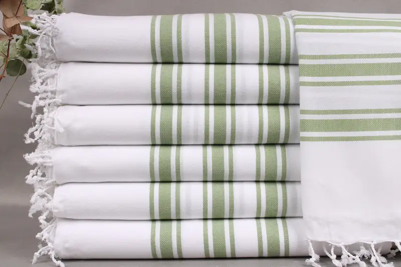 The towels are woven from organic Turkish cotton, ensuring high absorbency and durability. These towels measure 40x71 inches or 100x180 centimeters, weighing approximately 280 grams. Characterized by their hand-weaving process, they may have a tolerance of ± 2 inches or 5 centimeters in size.