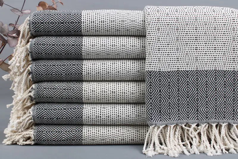 Composed of organic Turkish cotton, the product offers high absorbency and softness. Ensuring premium fiber composition, it is characterized by hand-weaving and superior craftsmanship. Dimensions are 40x70 inches or 100x180 centimeters, with a weight range of 425-475 grams. Hand-weaving tolerances of ±2" or 5cm are permissible.