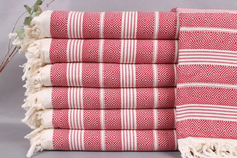 Organic Turkish cotton characterizes the towels, resulting in high absorbency and softness. Ensuring dimension consistency, each towel measures 38x69 inches or 95x175 centimeters, with a tolerance of ±2 inches or 5 centimeters. All towels are woven by hand with a weight of 440 grams.