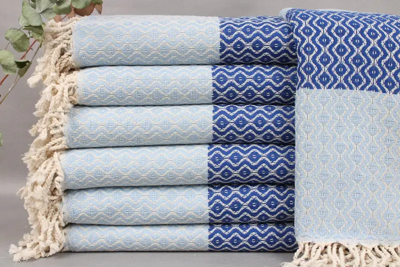 The Turkish towels are woven from organic Turkish cotton, ensuring durability and soft texture. Characterized by their high absorbency, the towels are crafted on looms, resulting in a handmade product that is both unique and high-quality. Each towel measures 40x71 inches or 100x180 centimeters, with a weight of 440 grams and a weaving tolerance of ± 2" or 5 cm.