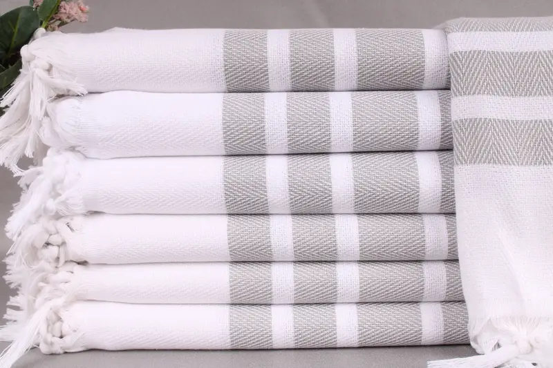 Organic Turkish cotton characterizes the towels, ensuring high absorbency and durability. Each towel, blanket, or hand towel measures 40x71 inches or 100x180 centimeters with a tolerance of ± 2 inches or 5 centimeters, weighing 380 grams. Hand-woven on looms, the towels may vary slightly in dimensions due to the weaving process.