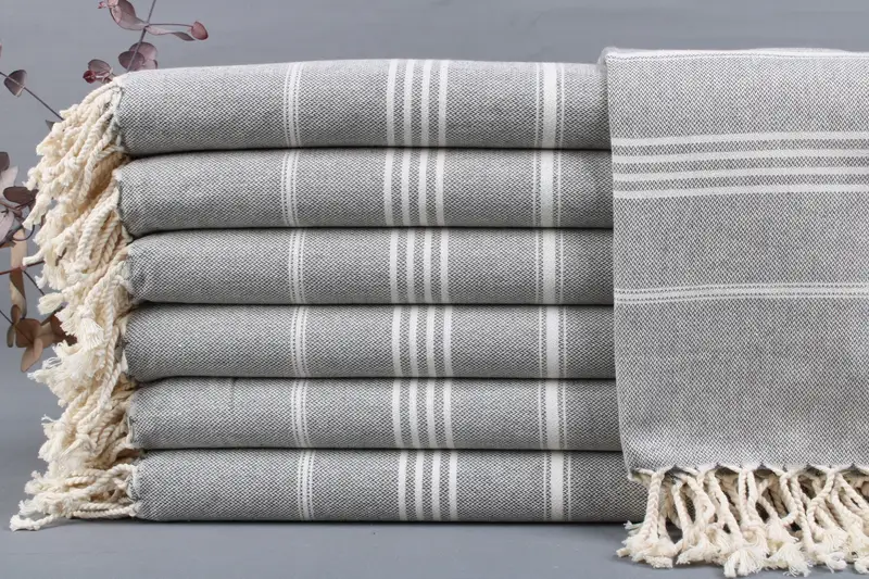 Organic Turkish cotton towels ensure maximum absorbency and a soft texture. Characterized by their dimensions of 40x70 inches or 100x180 centimeters, these towels have a weight range of 425-475 grams. The hand-weaving process results in a tolerance of ± 2 inches or 5 centimeters.