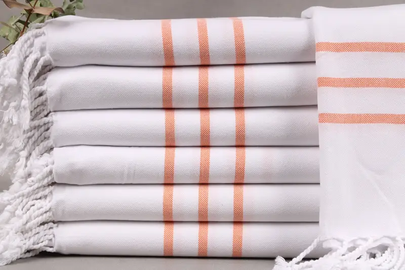 Turkish bath towels are characterized by their organic Turkish cotton composition, ensuring high absorbency and quality. The towels are woven by hand on looms, resulting in dimensions of 40x71 inches (100x180 centimeters) with a weight of 420 grams. Weaving tolerances may result in size variations of ±2 inches (±5 centimeters).