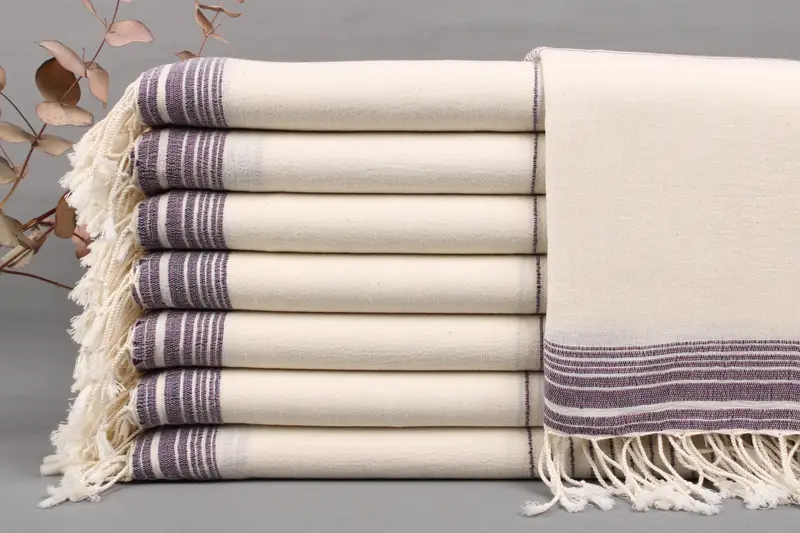Specifications include handmade beach towels, beach blankets, and throws, all featuring hand-woven organic Turkish cotton. The woven nature results in subtle dimensional variances. Weight consistency is maintained between 425-475 grams per item.