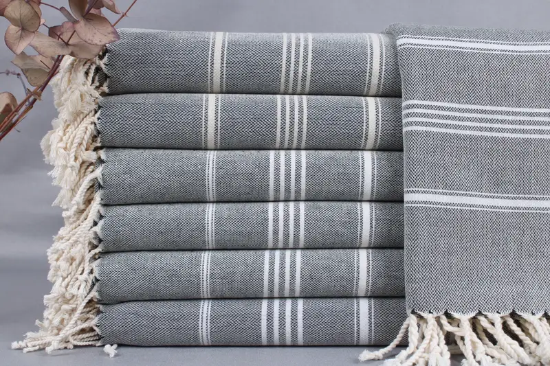 Organic Turkish cotton characterizes the beach towels, with each piece woven from sustainable fibers, ensuring durability and eco-friendliness. Resulting in an absorbency that is ideal for various uses, these towels measure 40x71 inches or 100x180 centimeters, weighing 360 grams. Dimensions may vary by ±2 inches or 5 centimeters due to the hand-weaving process.