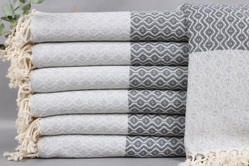 Organic Turkish cotton ensures high absorbency and durability in each towel, blanket, or hand towel. Resulting in light gray-dark gray hues, these products range from 40x71 inches to 100x180 centimeters, weighing approximately 440 grams. Characterized by 2% size tolerance due to hand-weaving, each item meets stringent quality standards.