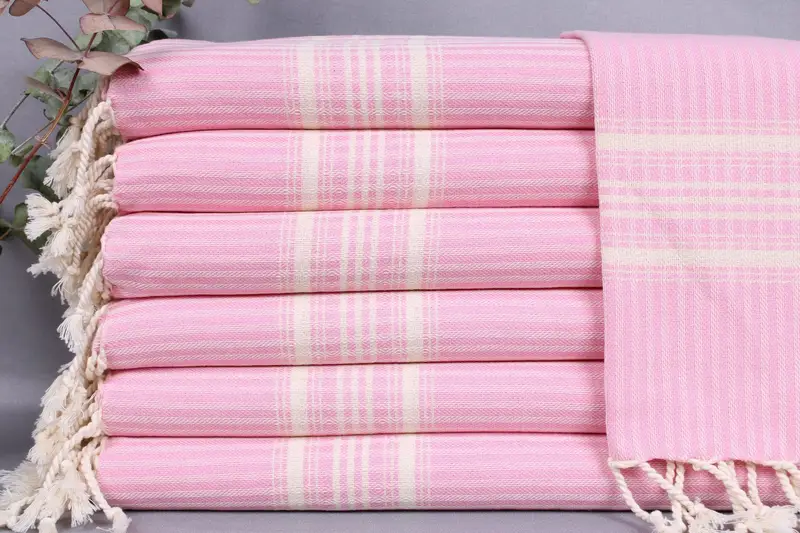 Organic Turkish cotton characterizes these towels, ensuring a soft and durable product. Resulting in exceptional absorbency, the towels are 18x40 inches or 45x100 centimeters and weigh 90 grams. Tolerances in hand-weaving dimensions may be up to ± 2 inches or 5 centimeters.