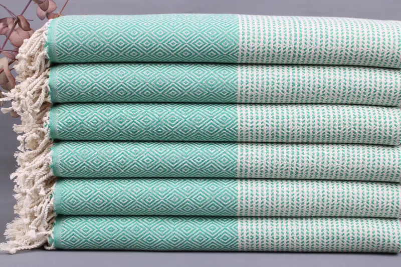 The fiber composition of the towels and throws consists of Organic Turkish Cotton, ensuring durability and enhanced absorbency. These products are characterized by their ability to become softer with each wash, achieving optimal softness post initial cleaning. Each piece measures 40x70 inches or 100x180 centimeters, with a tolerance of ± 2 inches or 5 centimeters due to the hand-weaving process. The weight ranges from 425 to 475 grams, contributing to their overall comfort and utility.