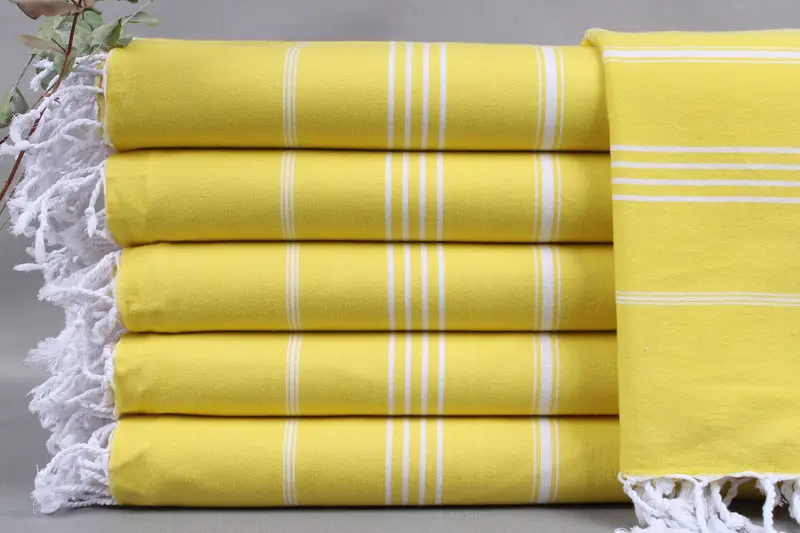 All listed towels and blankets are woven from Organic Turkish Cotton, characterized by their high absorbency and softness. Resulting from hand-weaving techniques, each item varies by ± 2 inches or 5cm due to tolerances, measuring 38x73 inches or 95x185 centimeters. Each piece weighs approximately 280 grams.