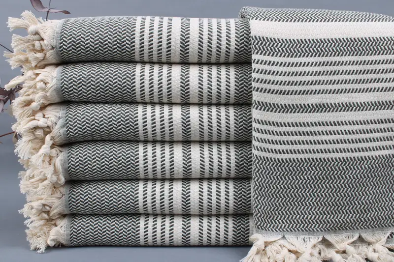 Woven from Organic Turkish Cotton, these towels are characterized by their durability and natural absorbency. Each towel is hand-woven on traditional looms, ensuring a unique product with slight size variations of ± 2 inches or 5 centimeters. Weighing approximately 420 grams, these towels measure 40x71 inches or 100x180 centimeters, providing a versatile size for multiple uses.