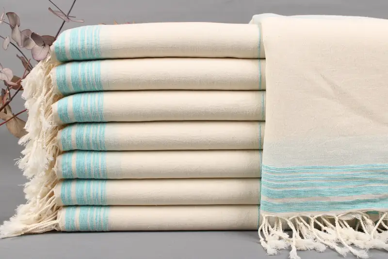 Organic Turkish cotton is utilized in weaving these towels, ensuring high absorbency and durability. Resulting in 40x70 inches or 100x180 centimeter dimensions, each item weighs between 425-475 grams. Tolerances in size are ±2 inches or 5cm due to hand weaving.