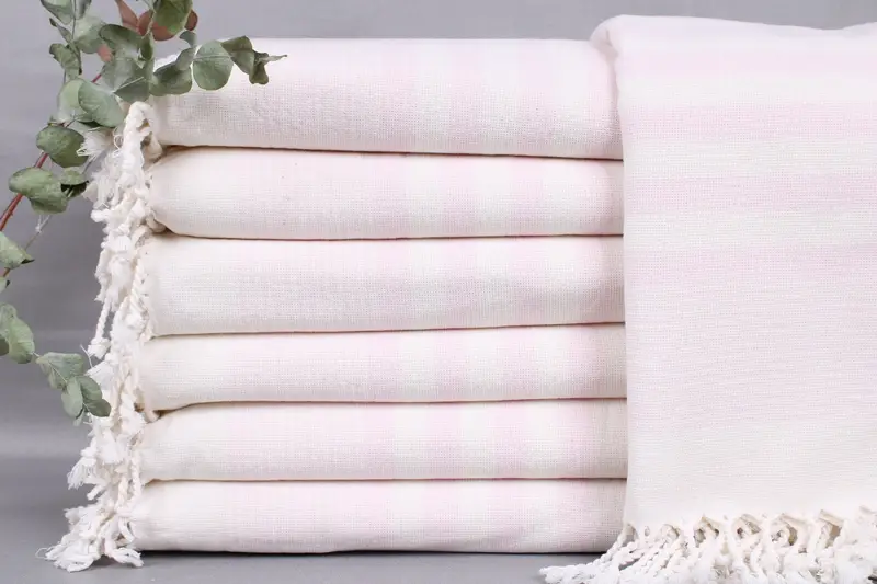 All beach towels and hand towels are woven from organic Turkish cotton, ensuring superior absorbency and durability. Resulting in dimensions of 40x67 inches or 100x170 centimeters, with a tolerance of ± 2 inches or 5 centimeters due to hand-weaving. Weighing 410 grams, these towels are characterized by their lightweight yet robust texture.