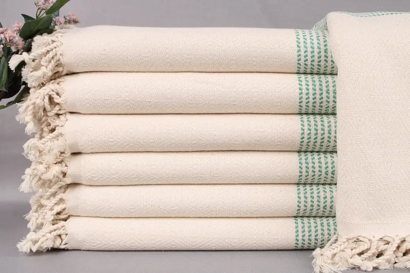 Turkish towels are woven from organic Turkish cotton, ensuring durability and sustainability. Characterized by their intricate hand-weaving process, these towels exhibit slight dimensional variations of ±2 inches or 5 centimeters. Weighing 450 grams, they provide a substantial, yet comfortable texture.