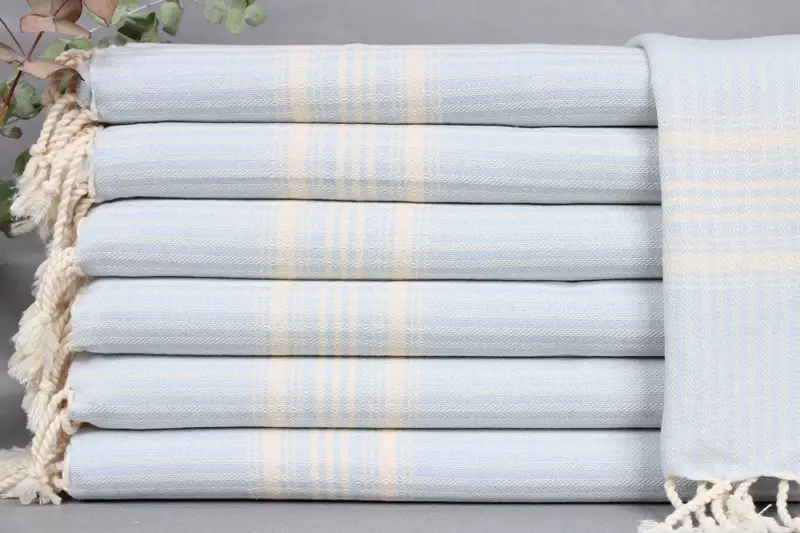 Each towel adheres to specific specifications including dimensions and weight, allowing for ± 2 inches or 5 centimeters in variation. The towels are woven by hand on looms, ensuring each piece maintains quality standards.