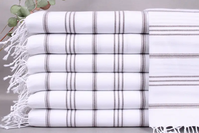 Organic Turkish cotton is utilized, ensuring high absorbency and durability for the towels. Each towel measures 24x36 inches or 60x90 centimeters and weighs approximately 100 grams. Tolerances of ±2 inches (5 centimeters) are expected due to the hand-weaving process.