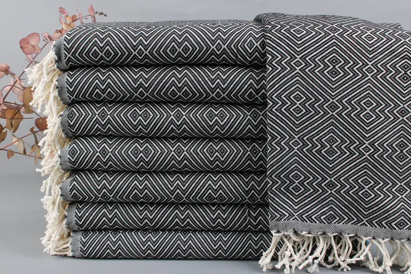 Woven from organic Turkish cotton, the beach towels exhibit high absorbency and softness, resulting in an ideal product for various uses. Measuring 40x75 inches or 100x180 centimeters, these towels weigh between 425 to 475 grams, with size tolerance of ± 2 inches or 5 centimeters due to the hand-weaving process. Customization options include embroidery or personalization with names or logos, adhering to specified placement and design preferences.