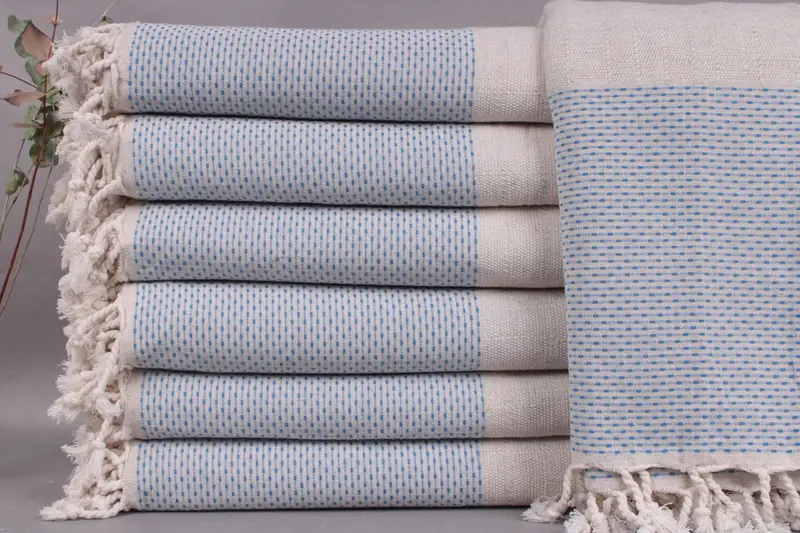Organic Turkish cotton forms the basis of the product, ensuring durability and softness. Resulting in a weight of 1500 grams, the blanket and towel options exhibit a generous size of 95x95 inches or 240x240 centimeters, with a tolerance of ±2 inches or 5 centimeters due to hand-weaving techniques. Customization options include personalized embroidery for towels, bedspreads, and blankets, allowing for name, letters, or logos to be sewn in specified font and color.