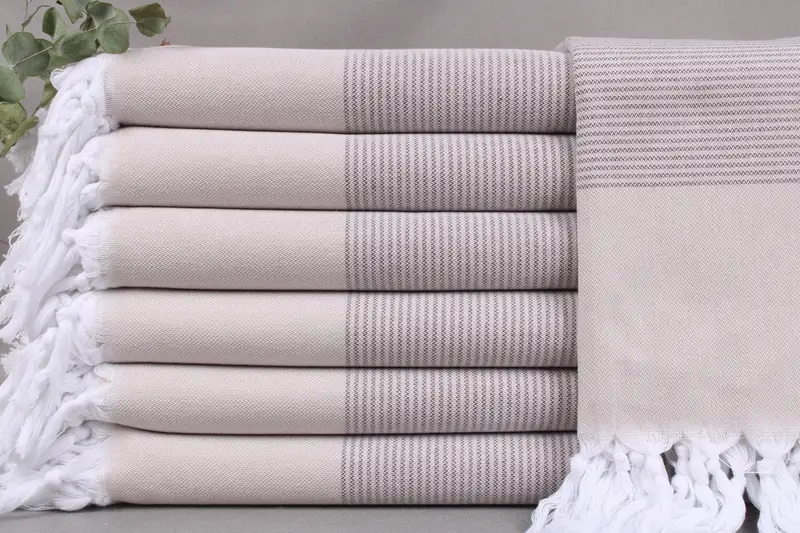 Each organic towel is woven from Turkish cotton, ensuring both high absorbency and softness. Characterized by a sub-category of baby blankets, these towels are distinguished by their secondary color, beige. Dimensions of the towels are 40x71 inches or 100x180 centimeters, with a tolerance of ± 2 inches or 5 centimeters resulting from the hand-weaving process. These towels weigh approximately 300 grams, providing a substantial yet comfortable feel.